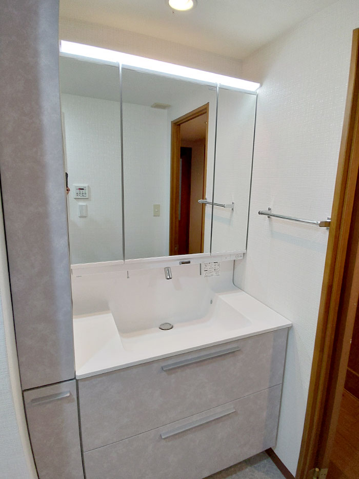 今回は広い洗面カウンターがついている状況から、収納力に特化した洗面化粧台に交換しました。